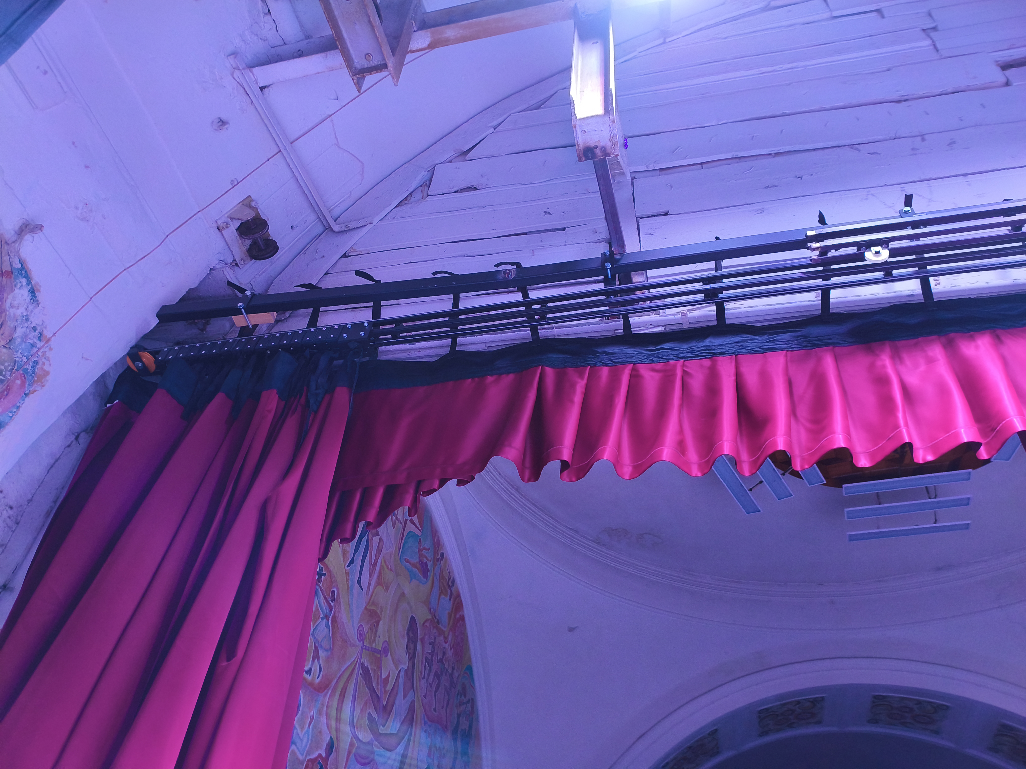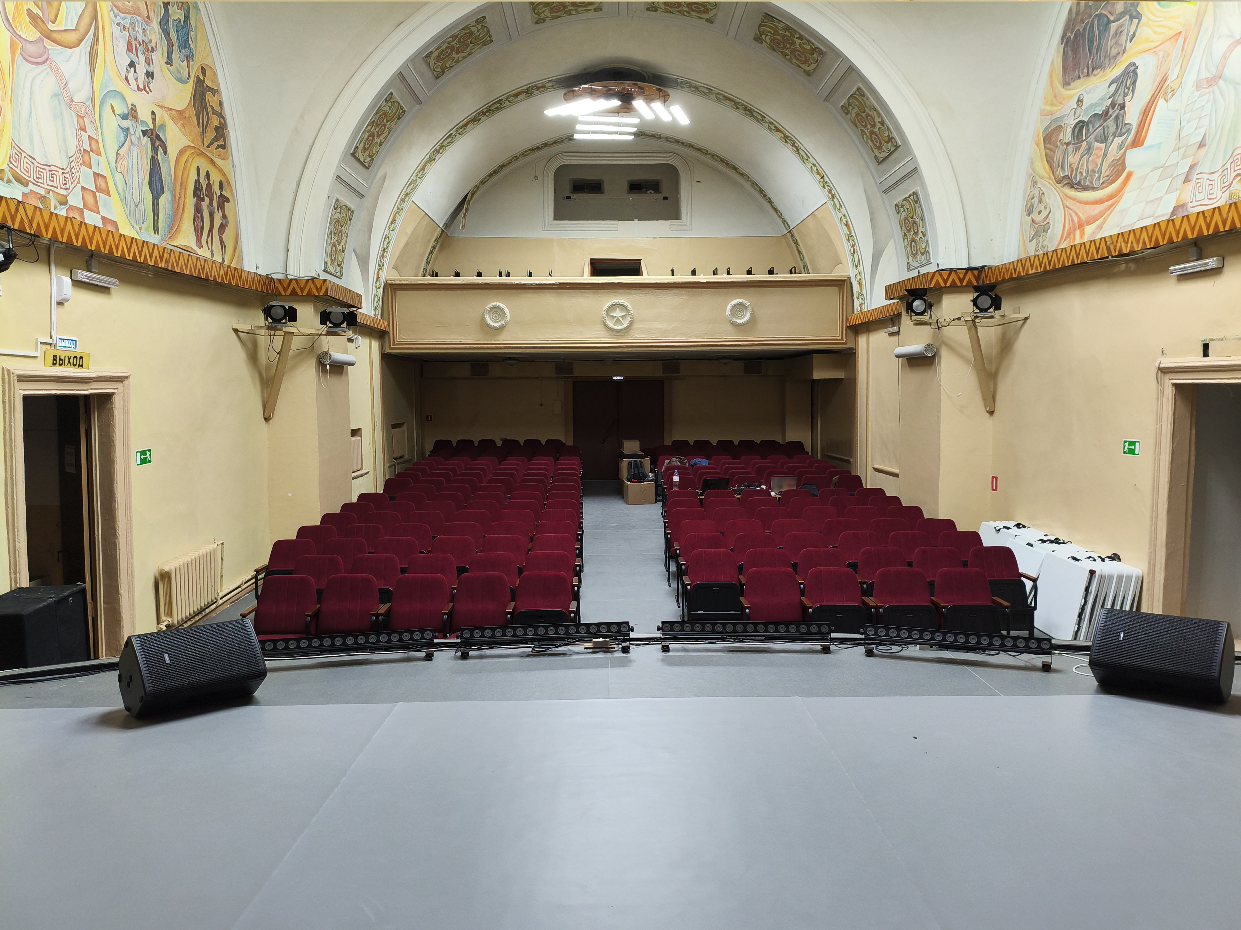 В ДК проведены демонтажные работы старого светового оборудования и одежды сцены. Проведены работы по монтажу новой системы удержания для световых приборов, одежды сцены и дороги АРЗ над сценой.