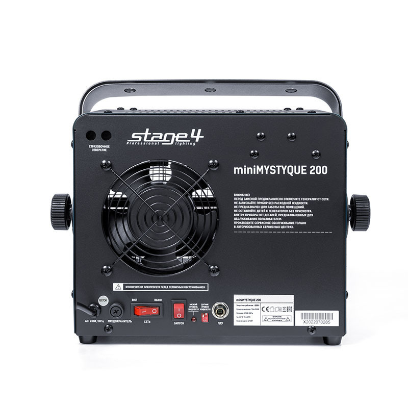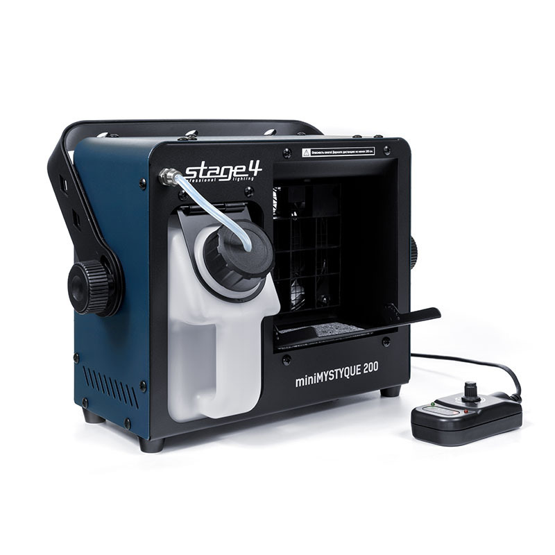 STAGE4 - miniMYSTYQUE 200. Компактный генератор сценического тумана, работающий на жидкости на водной основе. Мощность нагревателя - 200Вт, емкость для жидкости - 1,5л, управление - проводной ПДУ, время нагрева - 70 сек, производительность - 85мᶟ/мин, расход жидкости - 2,2 мл/мин