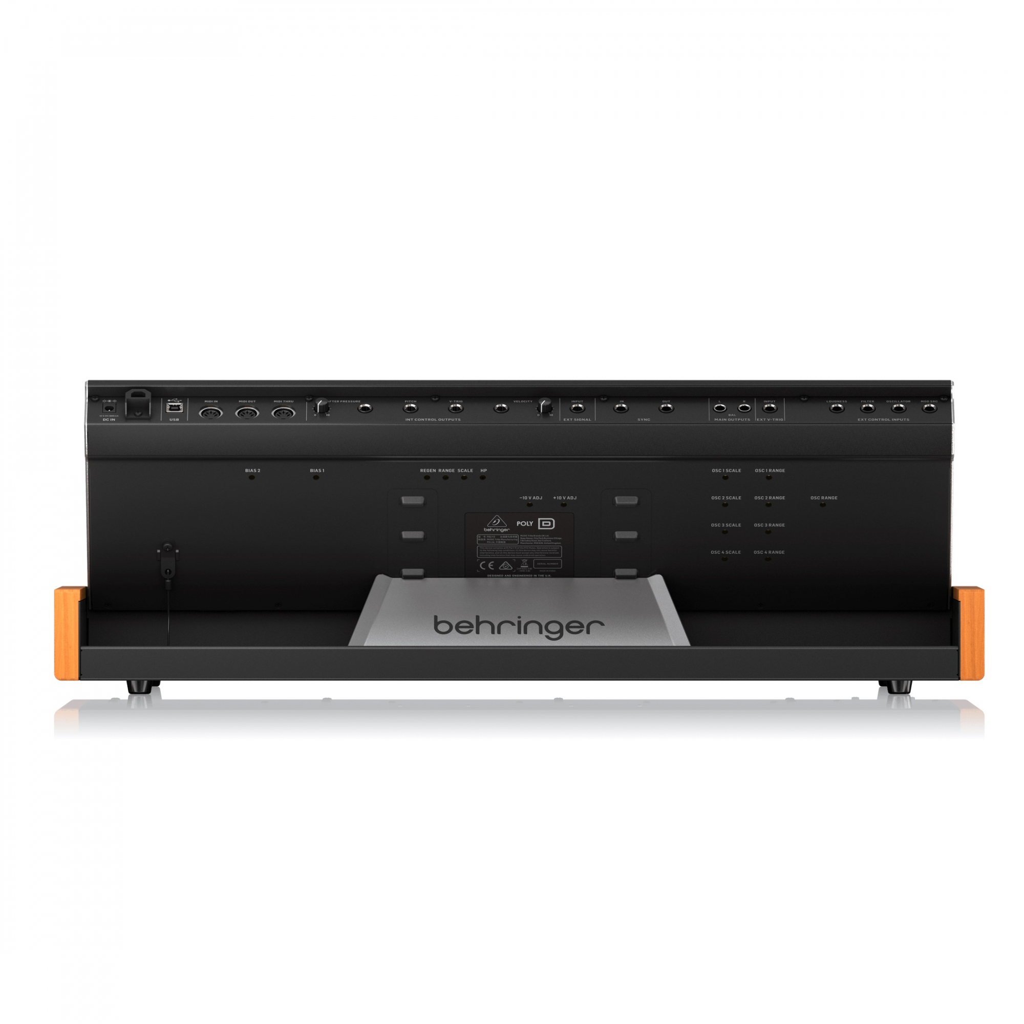 Behringer Poly D - аналоговый синтезатор, реплика классического синтезатора Moog Minimoog Model D. Главным отличием модели от оригинала стало наличие условно 4-голосной полифонии (по факту это расширенная парафония). Синтезатор имеет 4 осциллятора (VCO), которые предлагают на выбор 5 форм волны. Осцилляторы 1, 2 и 3 включают в себя: треугольник, треугольник/пилу, пилу, квадрат, широкий импульс и узкий импульс. Четвертый осциллятор предлагает: треугольник, обратную пилу, пилу, квадрат, широкий импульс и узкий импульс. Каждый VCO можно настраивать в диапазоне 6 октав (LO, 32’, 16’, 8’, 4’ и 2’). Доступно 3 режима: Mono, Unison (две ноты в парафоническом режиме) и Poly (четыре ноты в парафоническом режиме). Инструмент оснащен традиционным муговским лестничным фильтром и низкочастотным осциллятором, 2 ADS, LFO, настройками для модуляций, а также встроенным хорусом и дисторшном. Алгоритмы хоруса основаны на хорусе синтезатора Roland Juno-60, а дисторшн представляет собой копию педали Boss DS-1. Помимо этого, модель имеет 32-шаговый секвенсор и арпеджиатор с набором паттернов. Синтезатор оснащен 37-клавишной полувзвешенной полноразмерной клавиатурой и имеет 84 элемента управления, доступных с передней панели. Доступны широкие возможности коммутации: 3 TRS выхода, 4 TRS входа Ext Control, 4 TRS выхода Ext Control, 2 TRS входа Ex Trig и Signal, входы Sync In/Out, порты USB и MIDI In/Out/Thru.